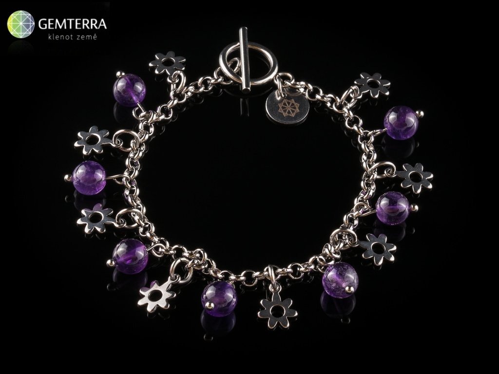 Náramek je tvořen technikou ketlování z korálků ametystu o velikosti a přívěsků z chirurgické oceli na řetízku ukončeném americkým zapínáním.